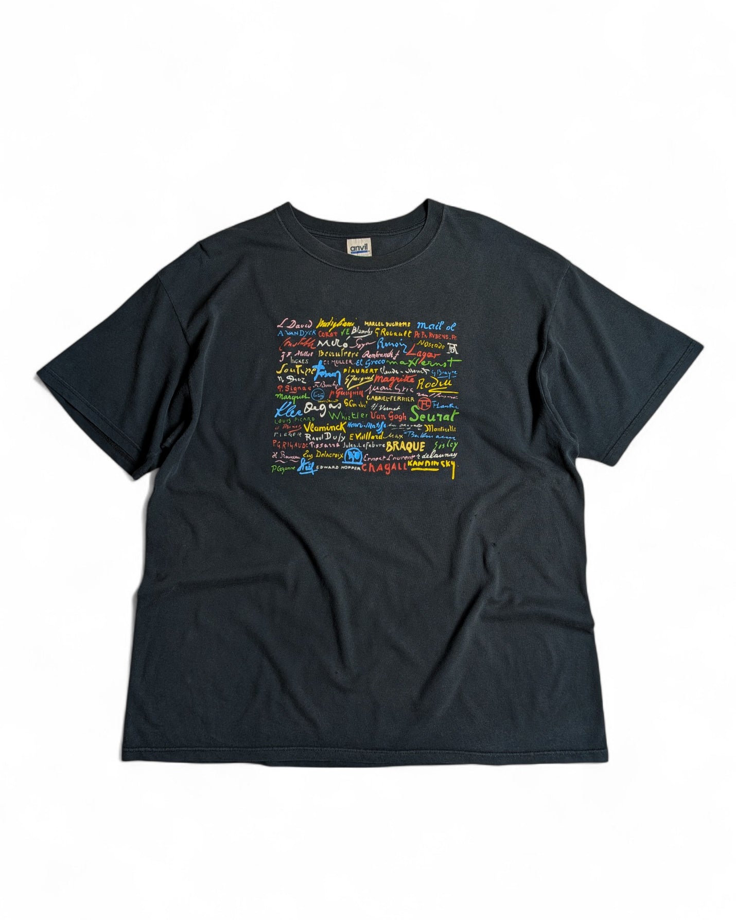 ルネサンスからモダンアートまで約70名の画家署名がプリントされたTシャツ。